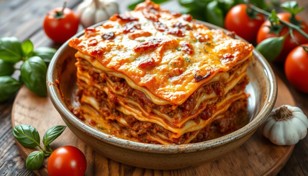 Les lasagnes à la bolognaise viennent du nord de l’Italie. Elles combinent pâtes, sauce bolognaise et fromage. Cela les rend délicieuses et nourrissantes. La recette est simple et demande peu d’ingrédients, comme des pâtes, de la viande hachée, des tomates et du fromage.